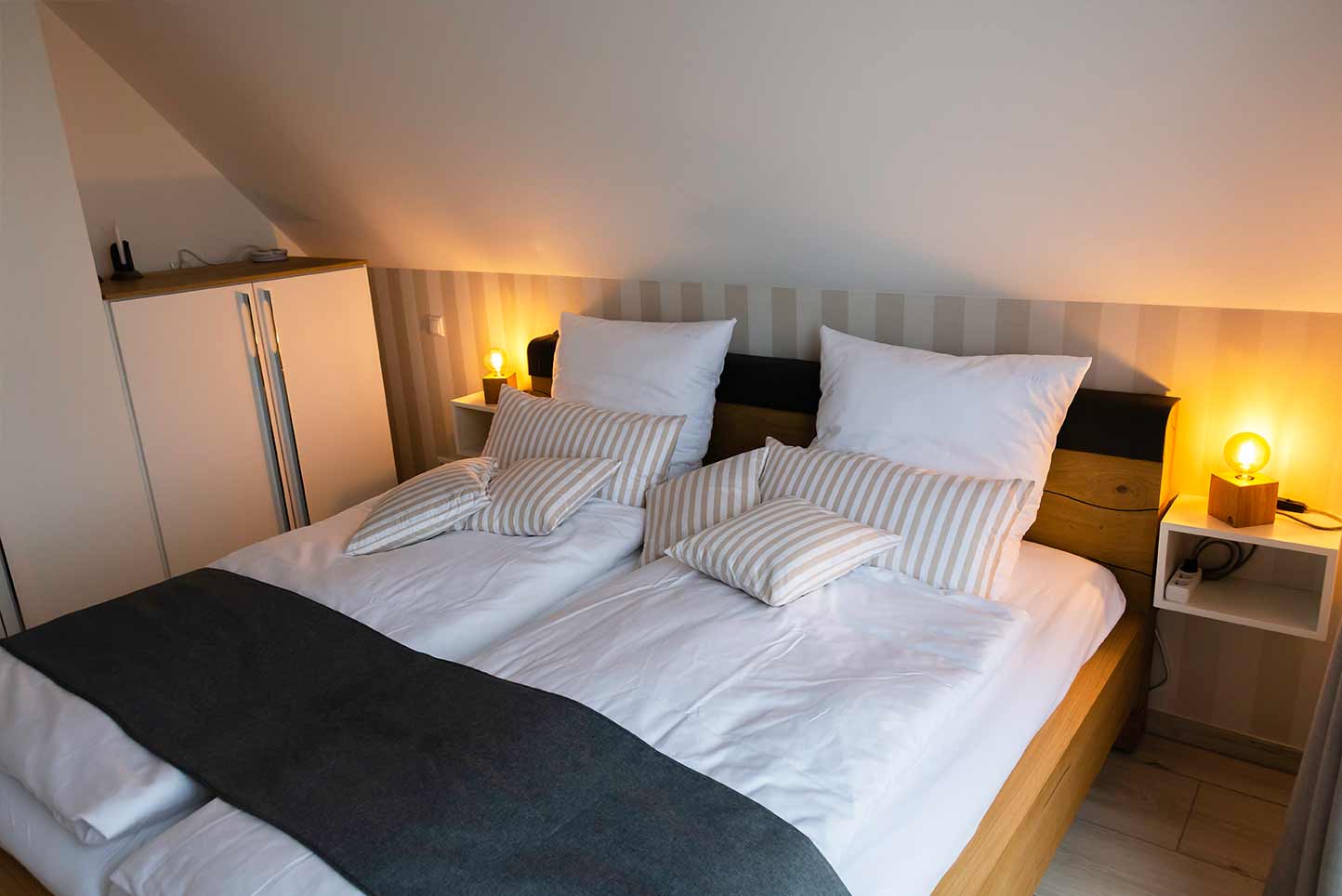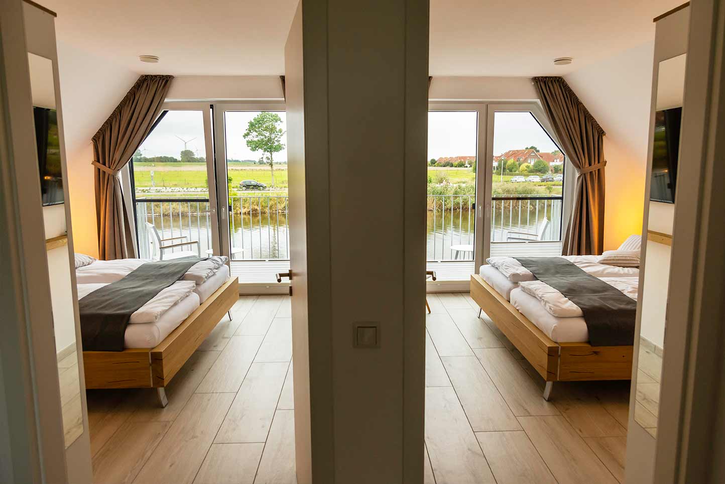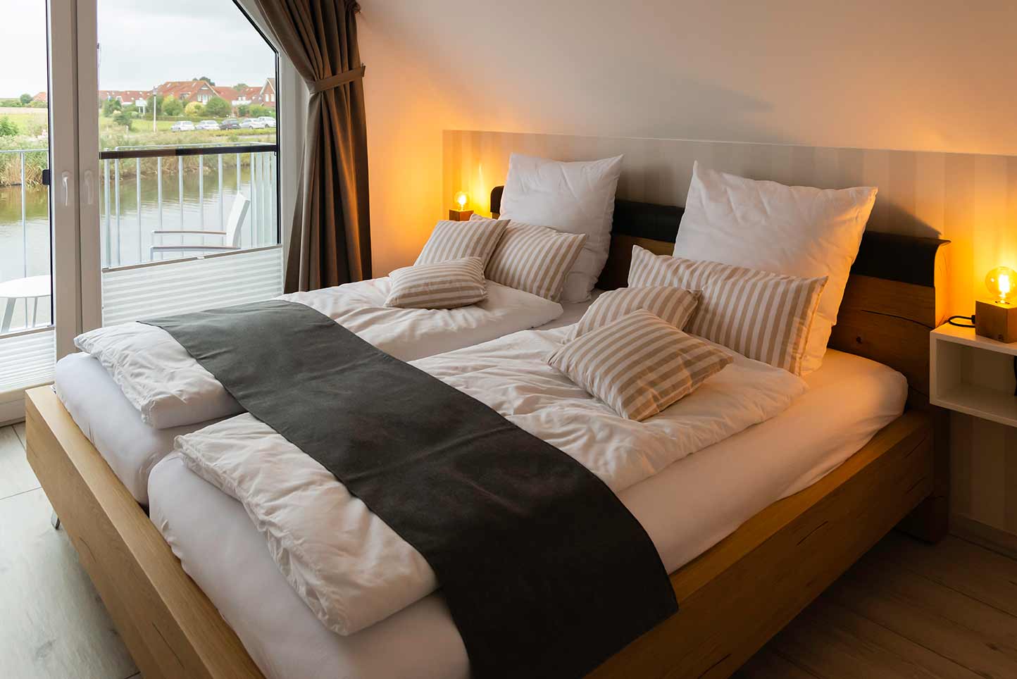 Im Obergeschoss des Pfahlhauses befinden sich die beiden Schlafzimmer mit moderner Einrichtung, sowie 49-Zoll-Smart-TV und bequemen Doppelbetten. Diese haben einen direkten Zugang zum Balkon.