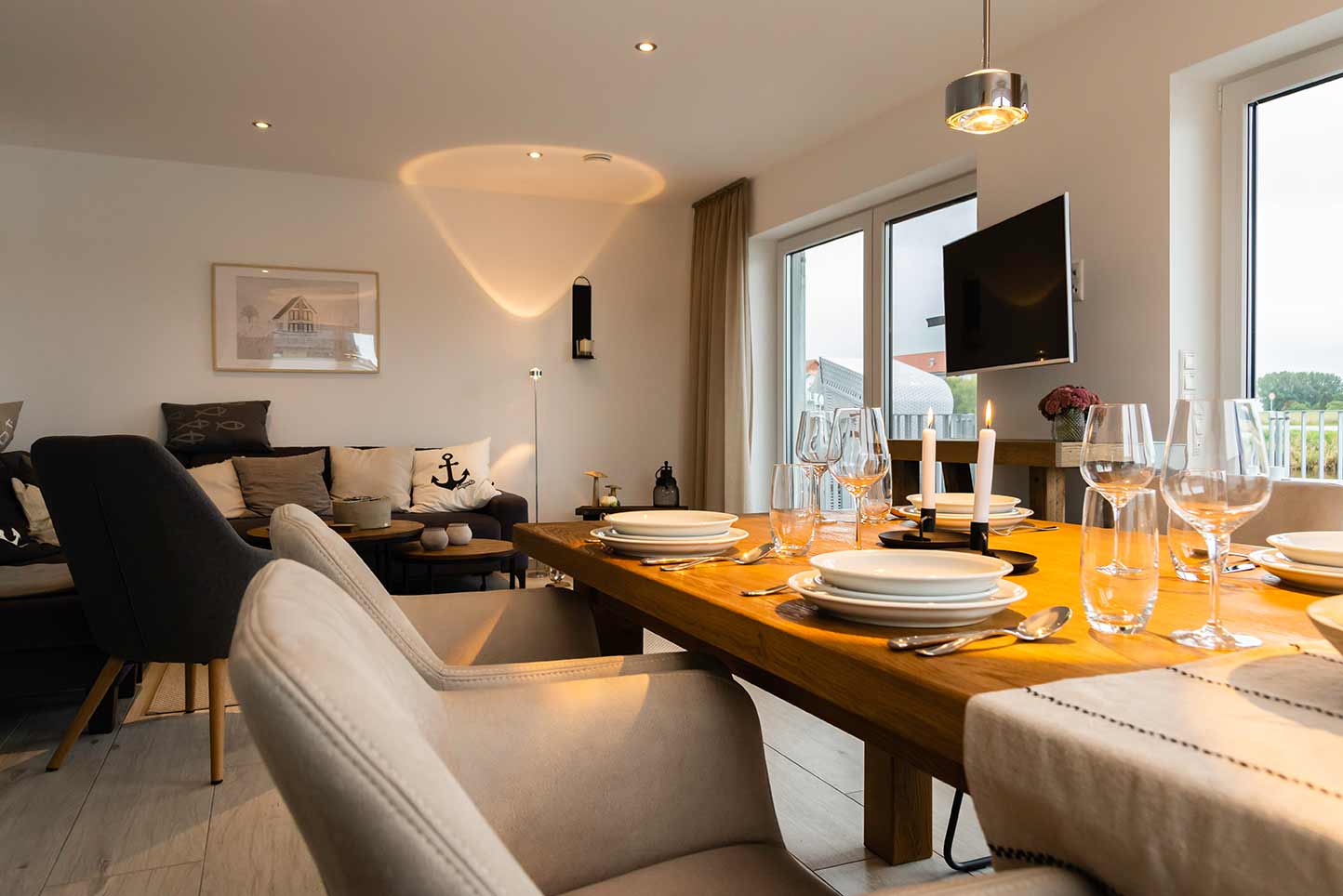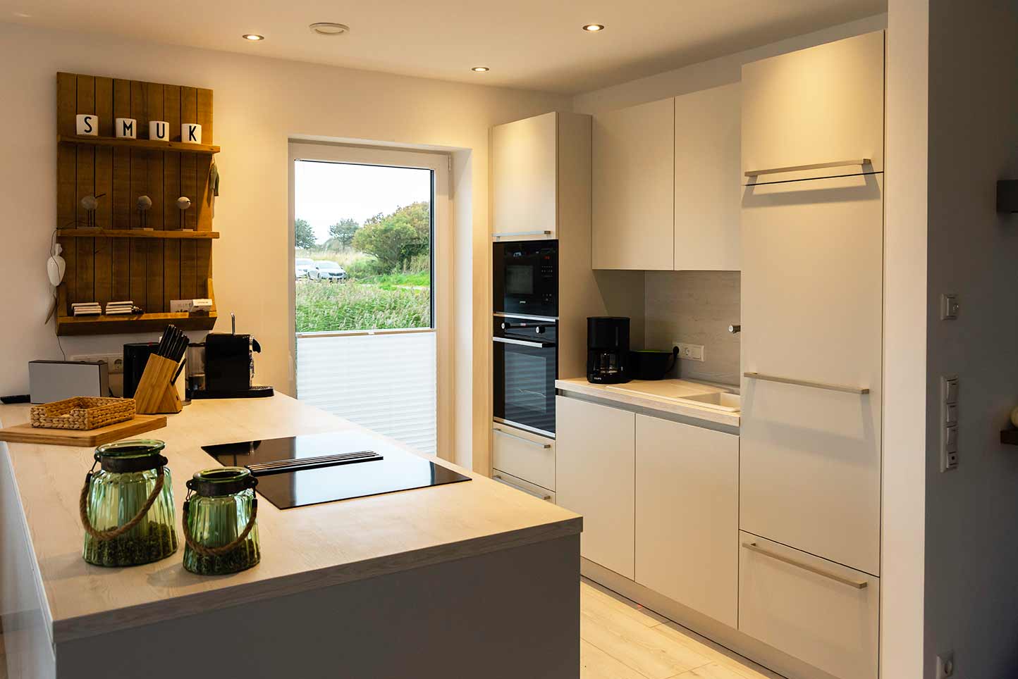 Der offene Wohn-Ess- und Küchenbereich mit Zugang auf die 25 qm Terrasse ist geräumig und modern eingerichtet. Die offene Küche ist hochwertig, mit modernsten Geräten ausgestattet.